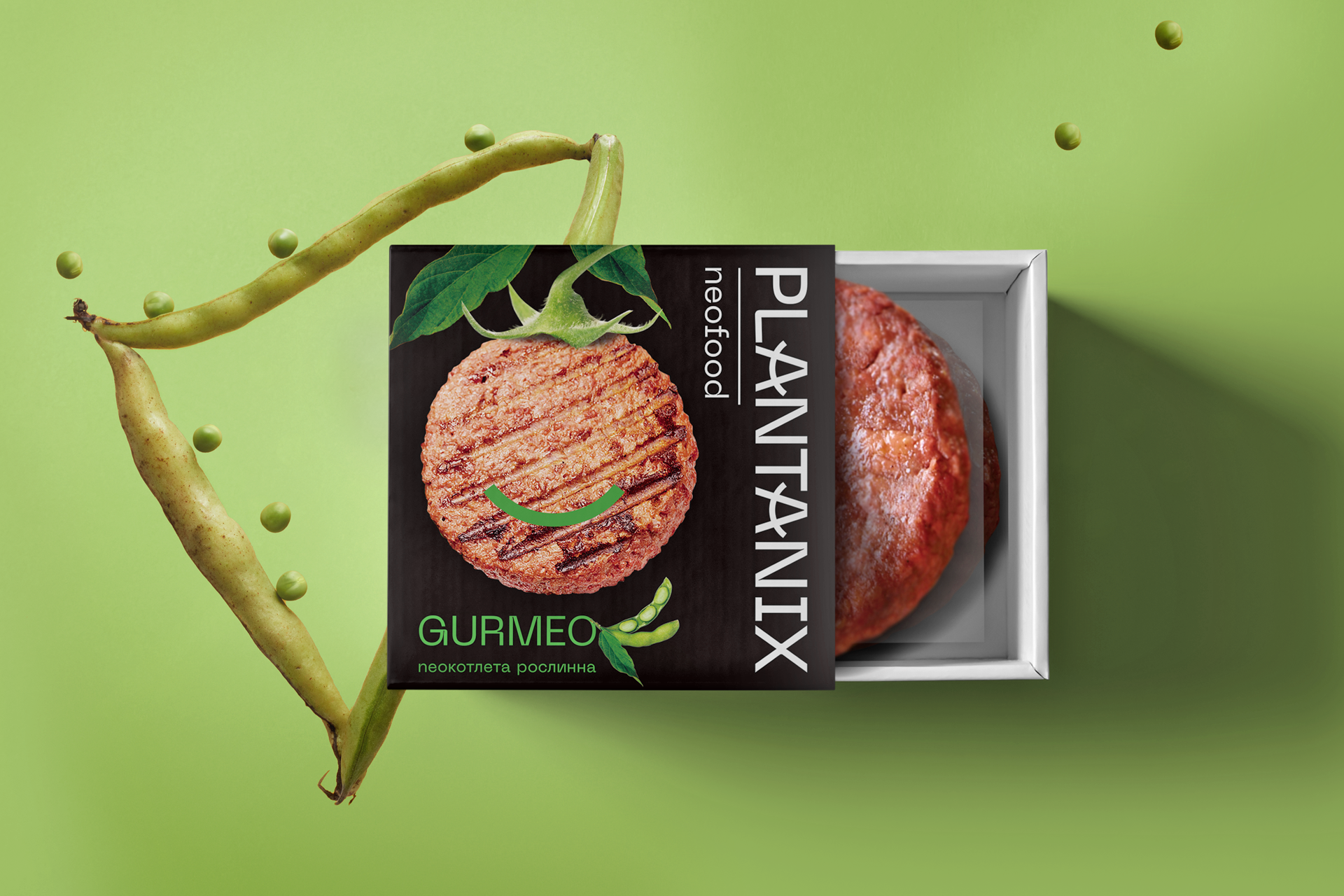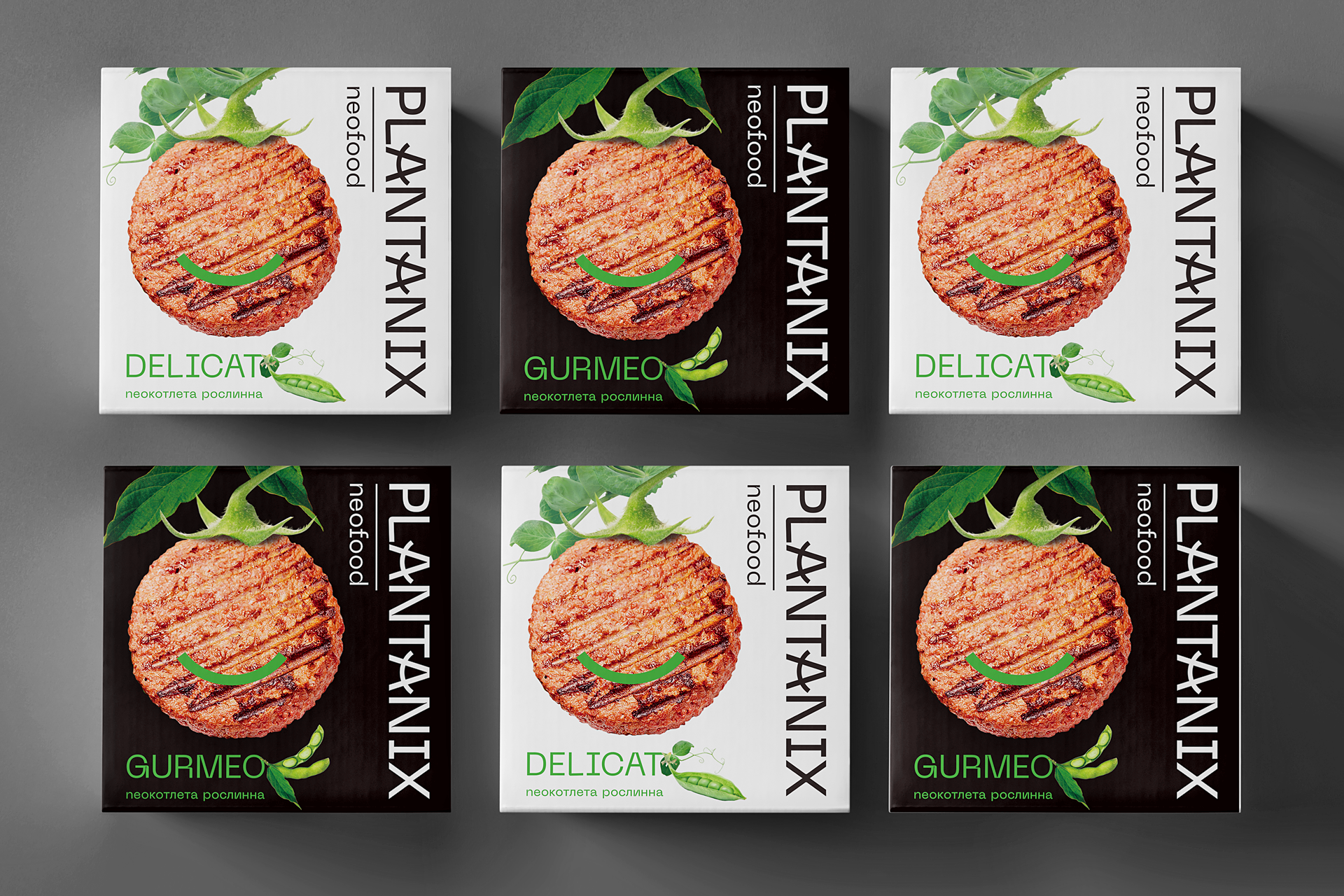 The product composes of two parts - pea cutlet and soy cutlet. A color code – black packaging for saturation (gurmeo) and white – for softness (delicat) – is applied to transmit the product specifics. A cutlet on a stem is a central image, the soy one is on the soy stem, the pea one is on the pea stem. And a green arc is smiling amiably. It is a proof that nobody has been injured while cooking a cutlet. A logo designed in a restrained manner with a simple font conveys the idea of a meaningful consumption.